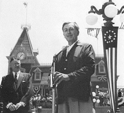 Disneyland’s opening day ceremony was a star-studded television affair. ABC film crews captured the pomp and circumstance for a summer broadcast special, “Dateline Disneyland.” Walt Disney, host of the ABC weekly primetime show “Walt Disney’s Disneyland,” welcomed guests to the theme park with an on-camera dedication speech.